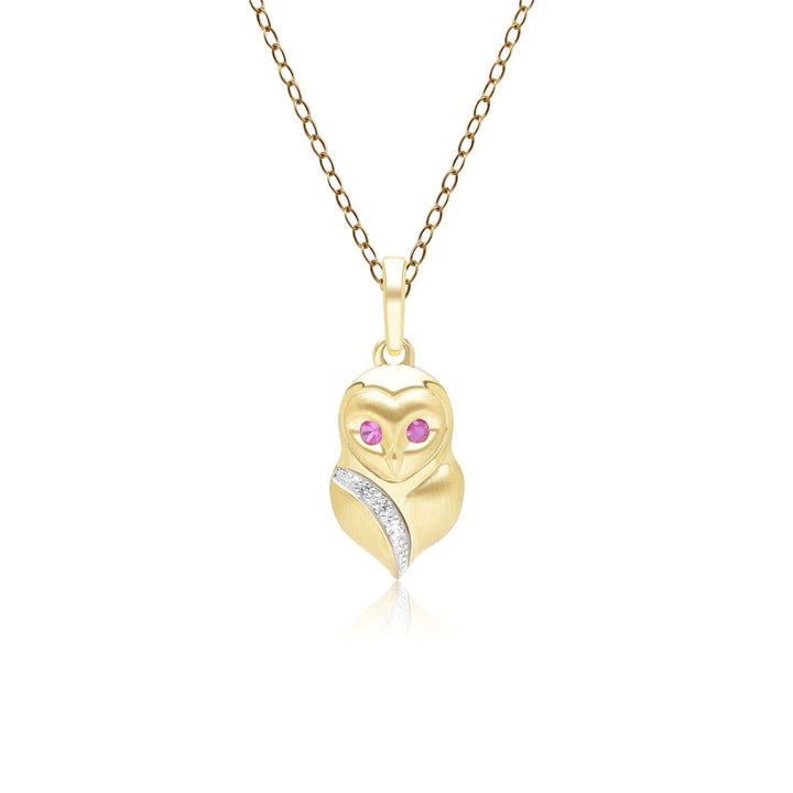 135P2128019 Gardenia Ruby and White Sapphire Owl Pendant Necklace in 9ct Yellow Gold Front