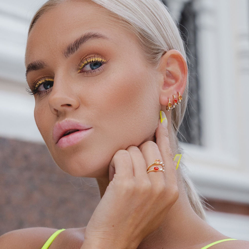 A gorgeous orange carnelian ring in 18ct gold plated sterling silver featuring a band lined with white topaz and white enamel twists. Wear alone as the star of the show or layer up with your favourite bands for a beautiful ring stack.