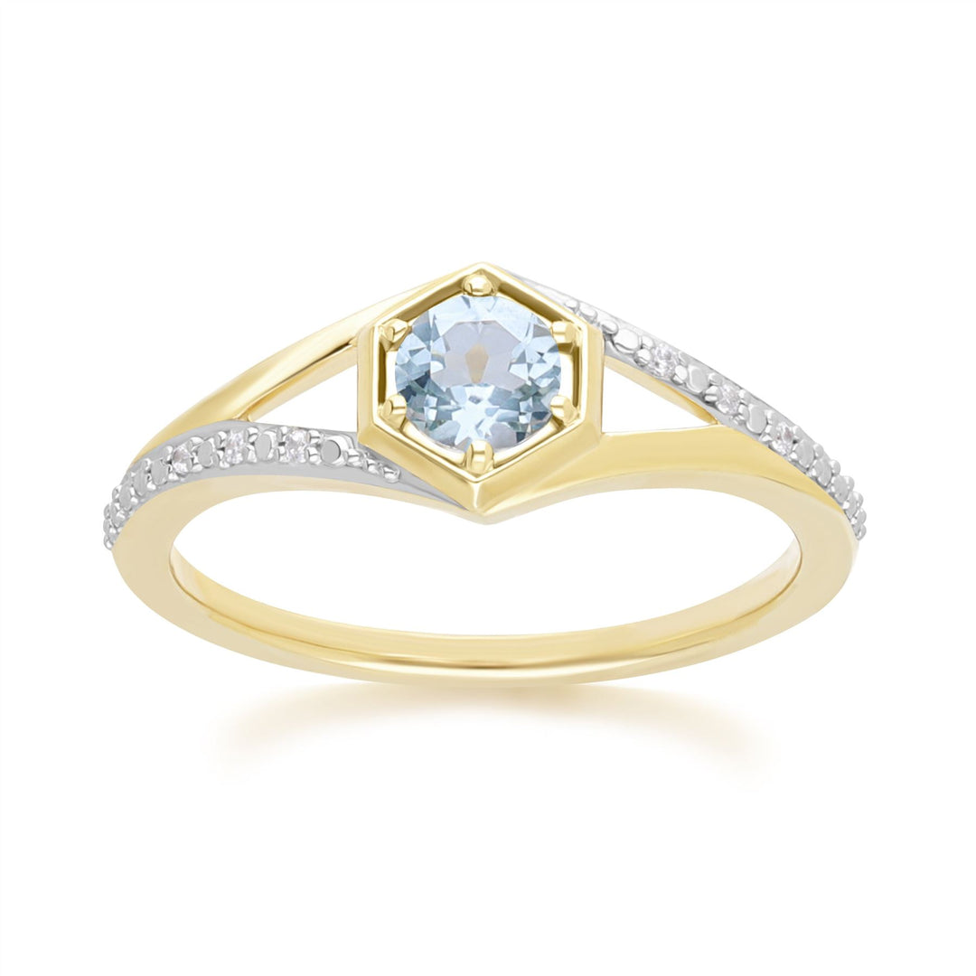 Geometric Hexagon with Prong set Round Topaz and Diamond Ring in 9ct Yellow Gold