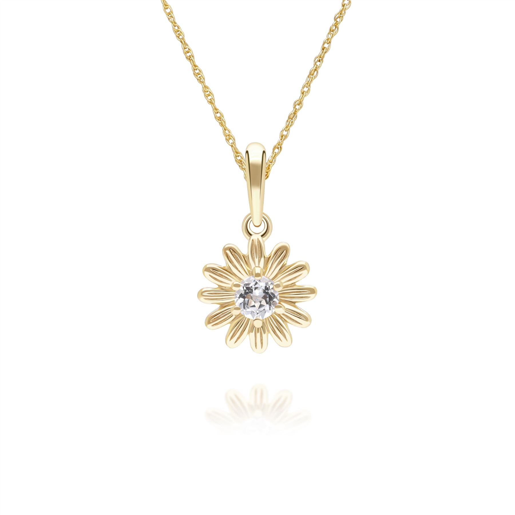 Glowing with floral elegance, this gardenia daisy pendant necklace features a round white sapphire set in 9ct yellow gold to create a timeless and refined fine jewellery design. The flower-inspired silhouette highlights the natural beauty and brilliance of the gemstone while maintaining a classic, graceful aesthetic. Crafted in solid 9ct yellow gold.
