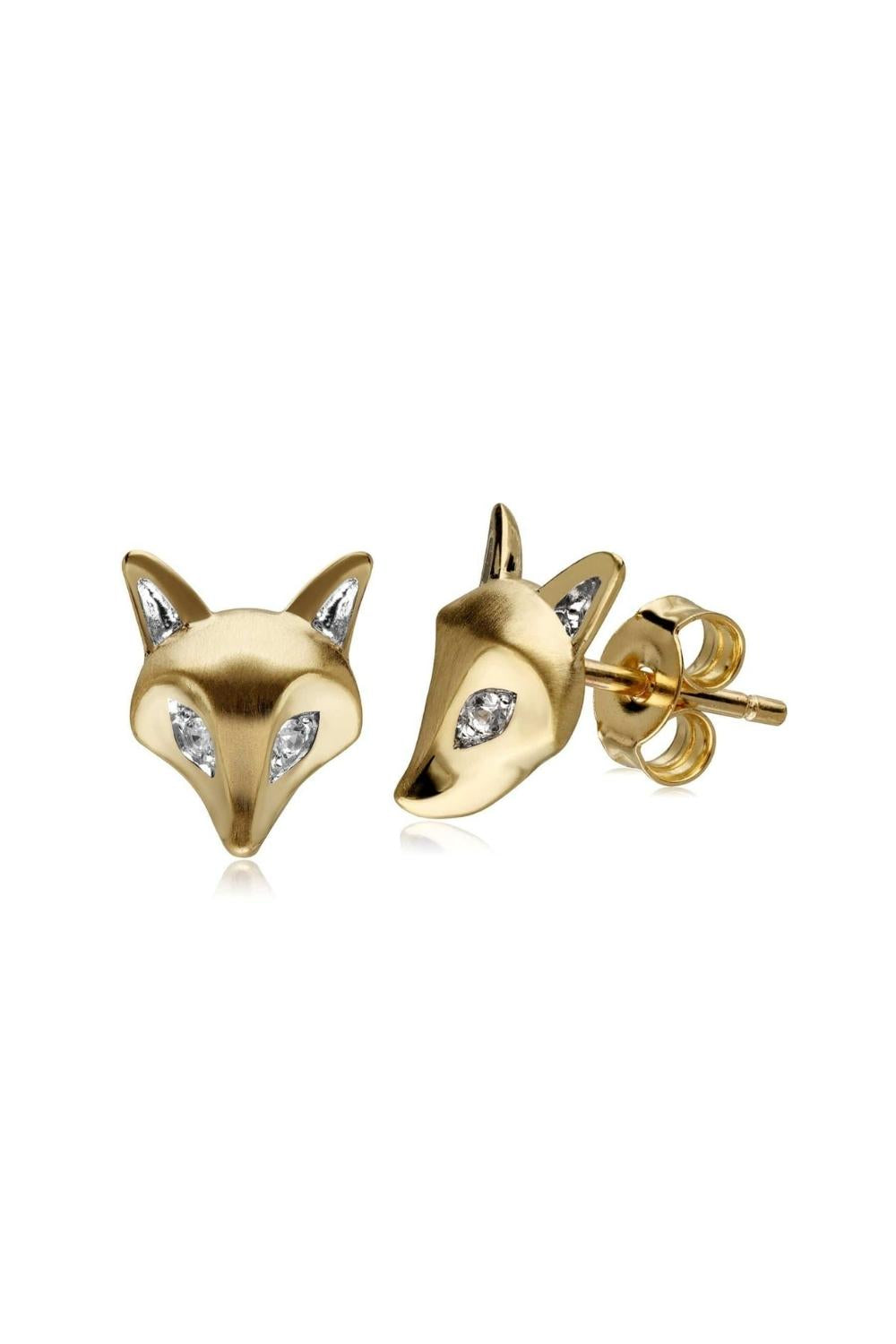 A beautiful 9ct yellow gold fox pendant with ruby eyes, a tail of white sapphires and a brushed gold finish.