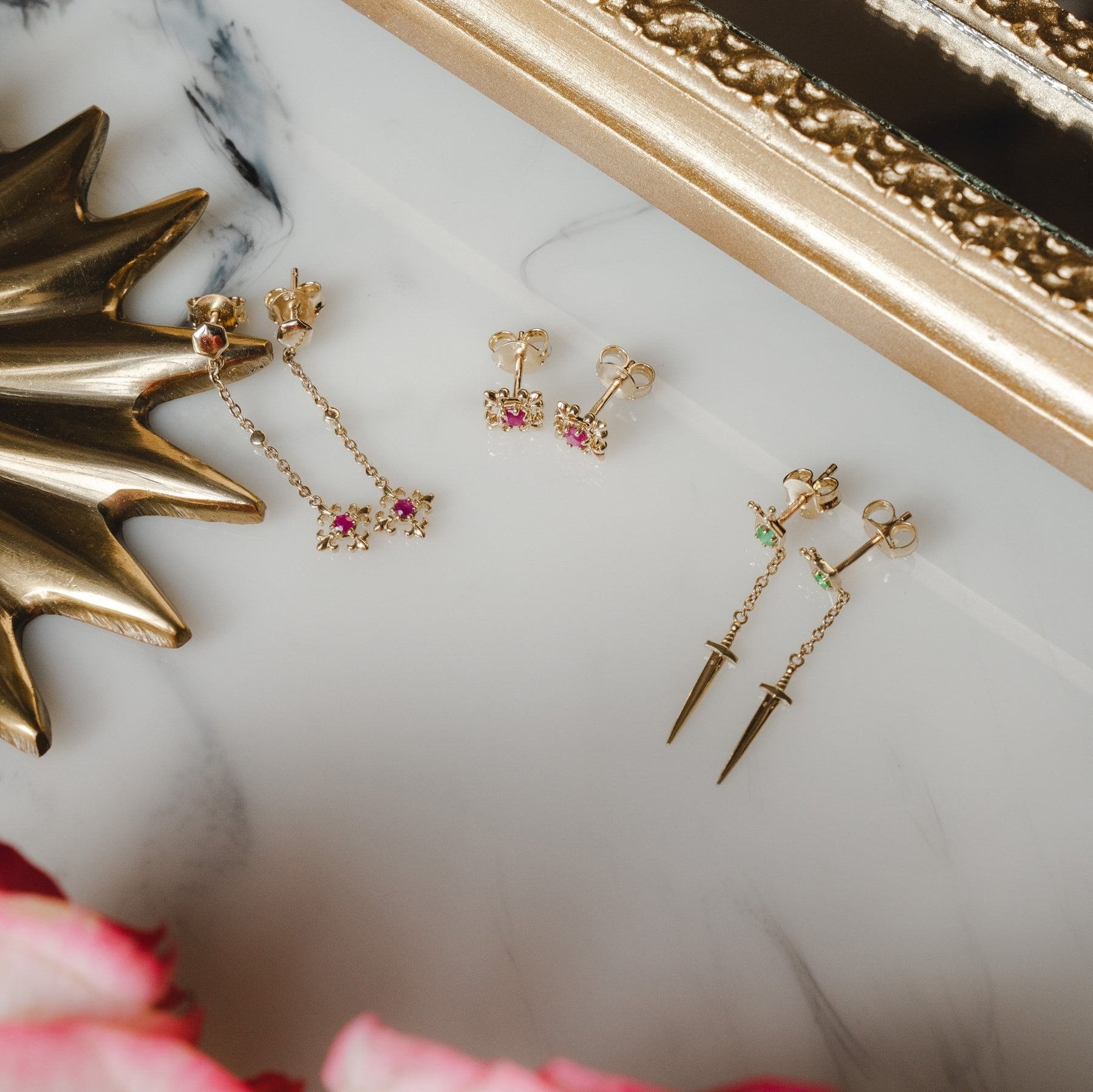 This stunning pair of 9ct gold earrings are inspired by the historical heroine of France and features two beautiful ruby gemstones held within a Fleur De Lis symbol suspended from a chain. Fleur De Lis is a decorative lily often used to represent Catholic saints of France. The perfect way to add power and elegance to your jewellery collection. These earrings have a post and butterfly back.
