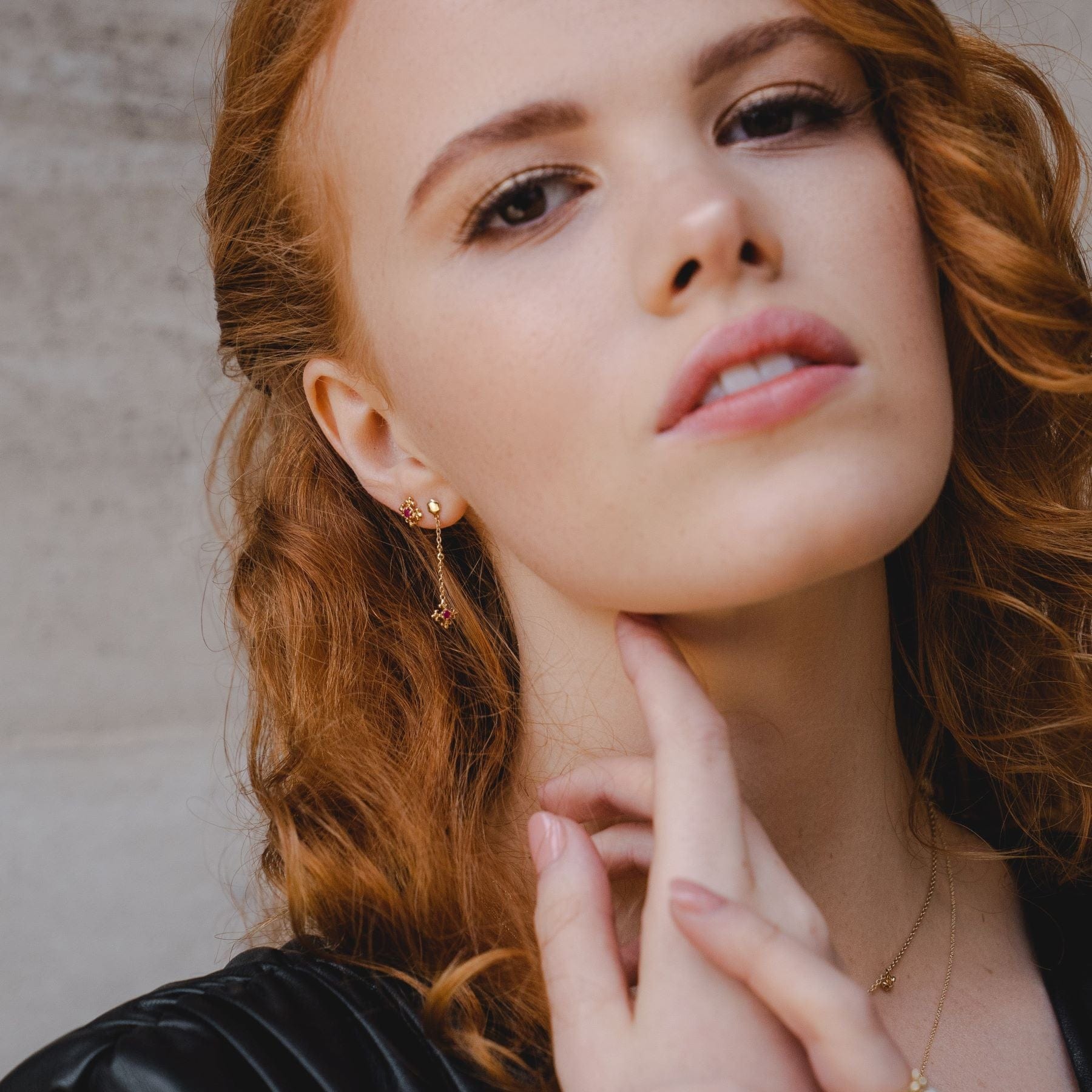 ECFEW™ Ruby Fleur De Lis Dangle Drop Earrings In 9ct Yellow Gold