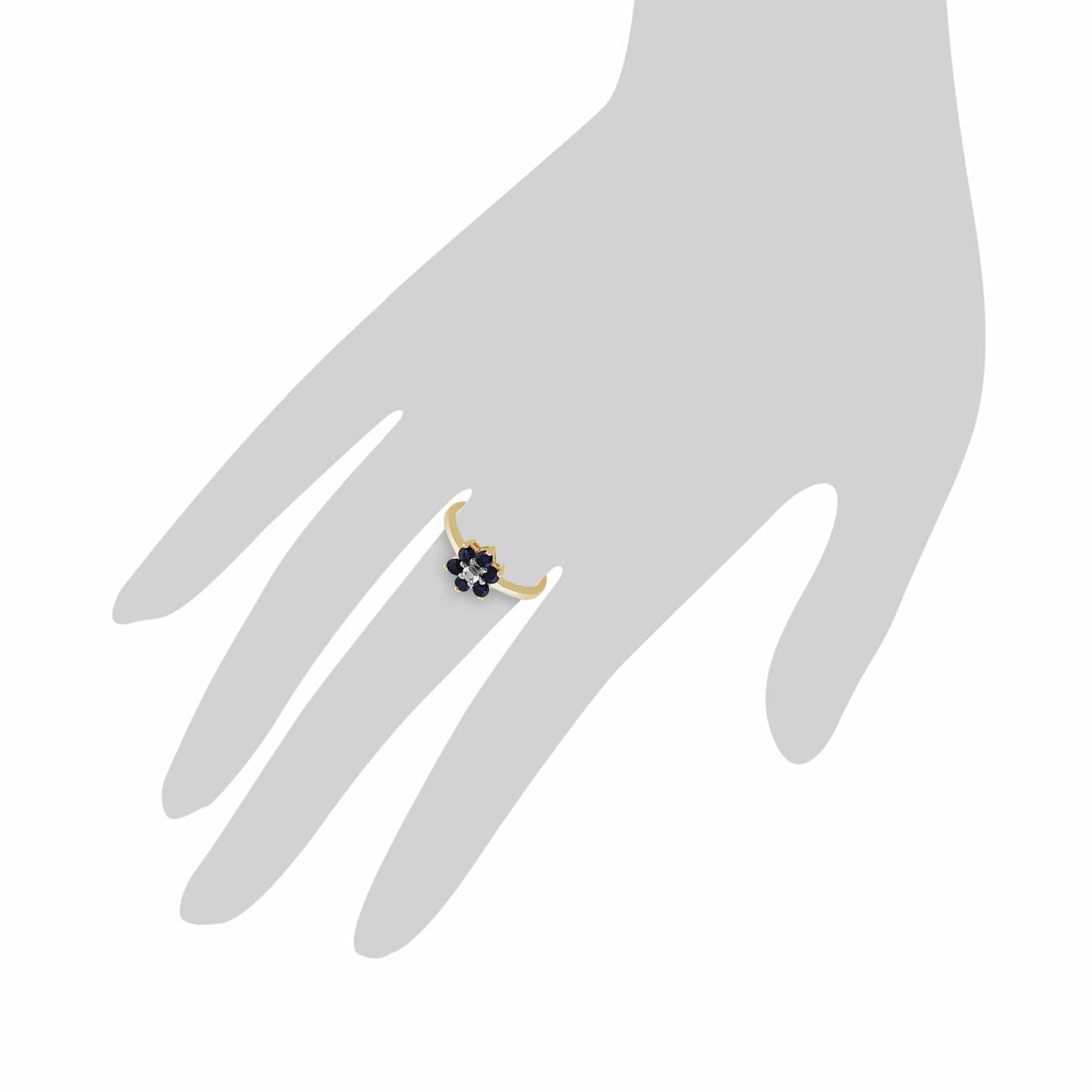 A stunning classic floral cluster design ring crafted from 9ct yellow gold set with 6 round cut faceted blue sapphire gemstones around a central sparkling white diamonds