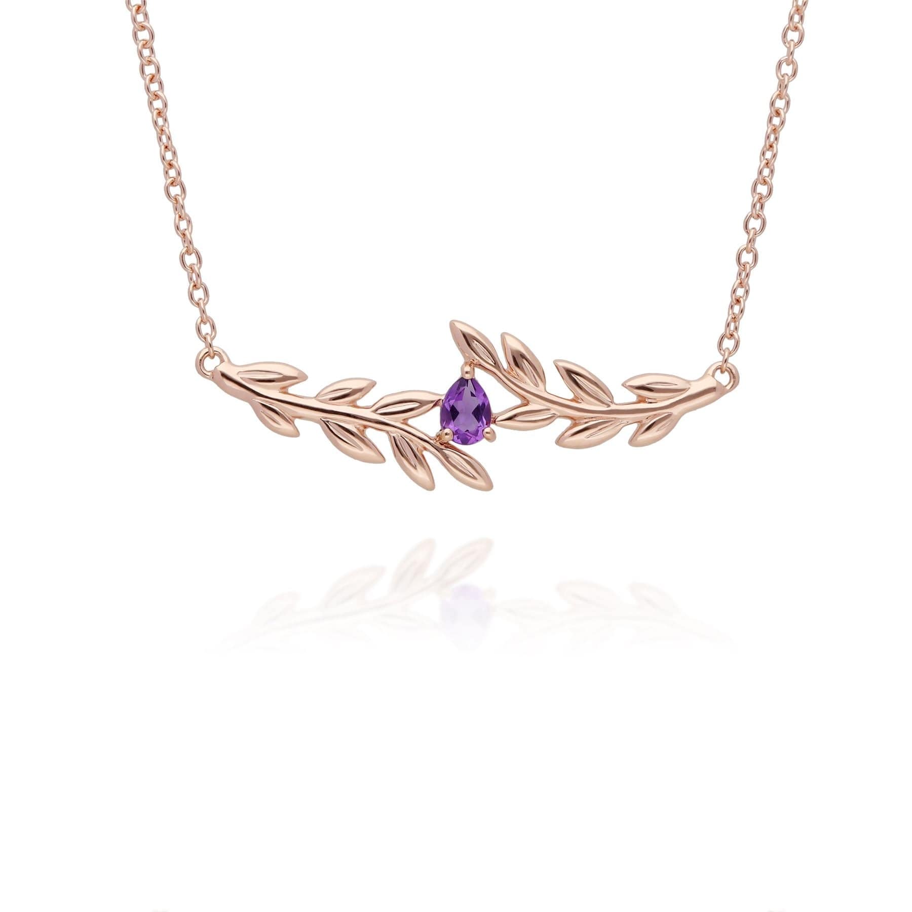 An elegant nature-inspired 9ct rose gold necklace with a central pear cut amethyst gemstone in a beautiful olive branch motif. The olive branch is a universally known symbol of peace.
