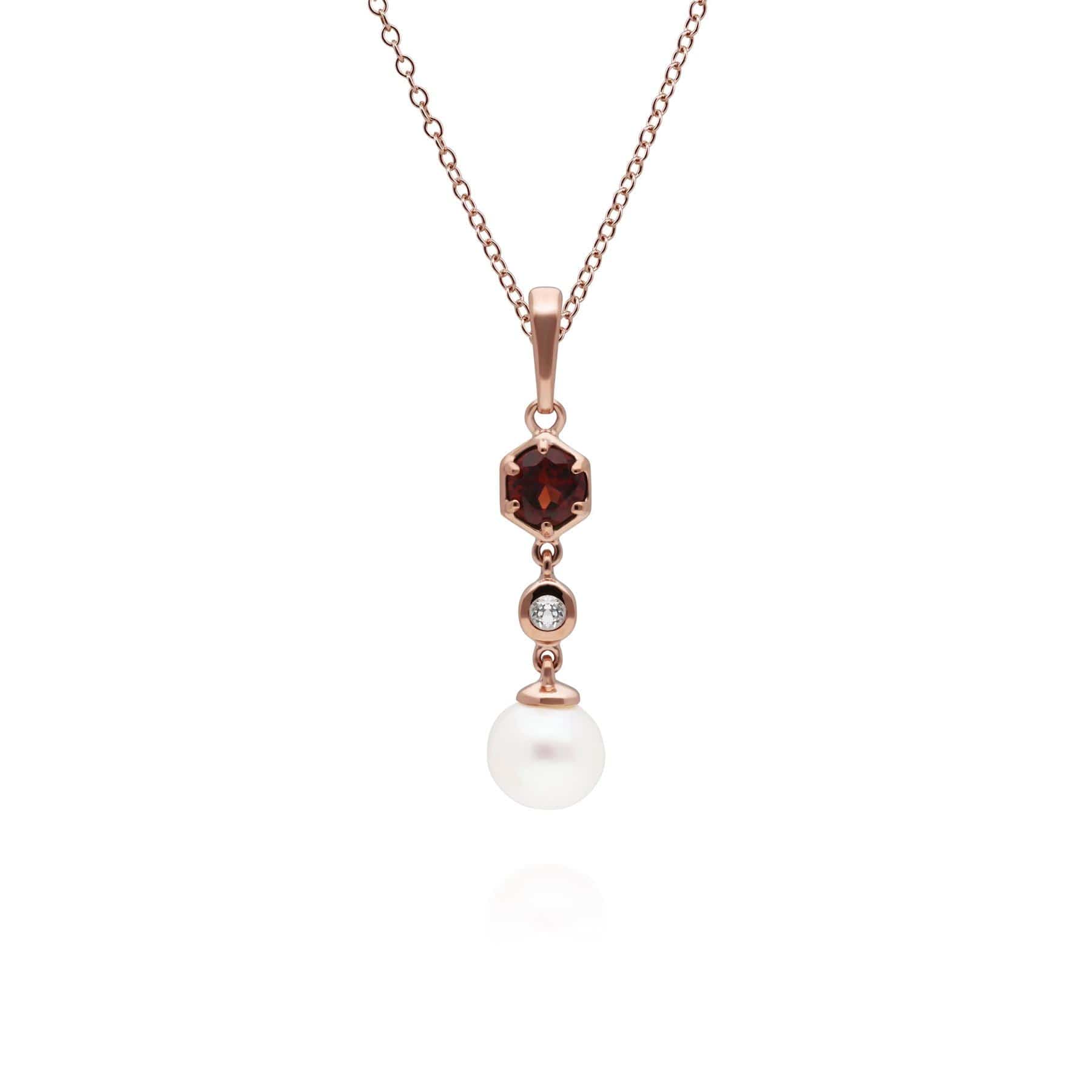 A chic and contemporary drop pendant with a cultured freshwater pearl that dangles beautifully from a geometric setting decorated with a red garnet and white topaz. This pendant is suspended on a matching rose gold plated sterling silver chain.