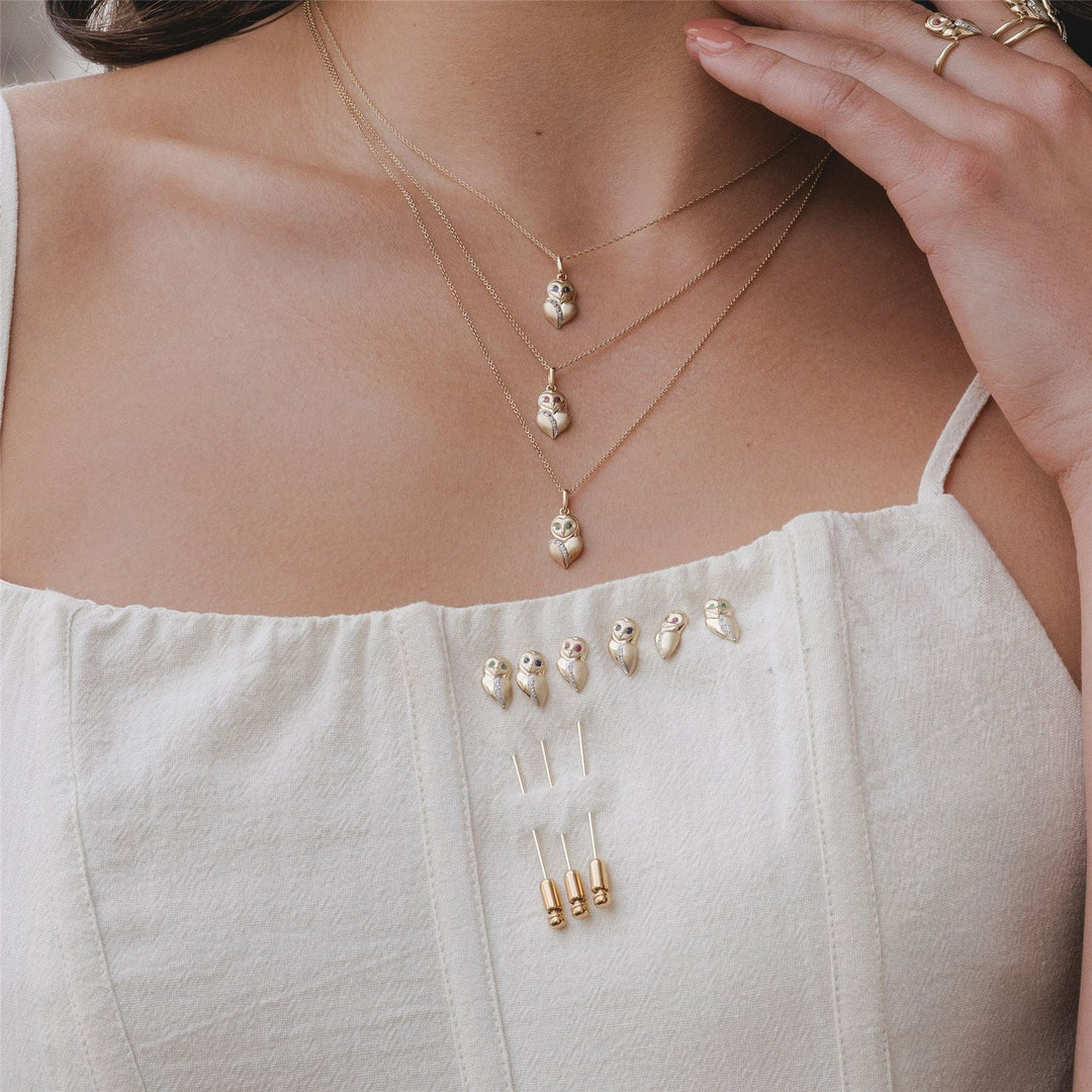 Gardenia Emerald and White Sapphire Owl Pendant Necklace in 9ct Yellow Gold
