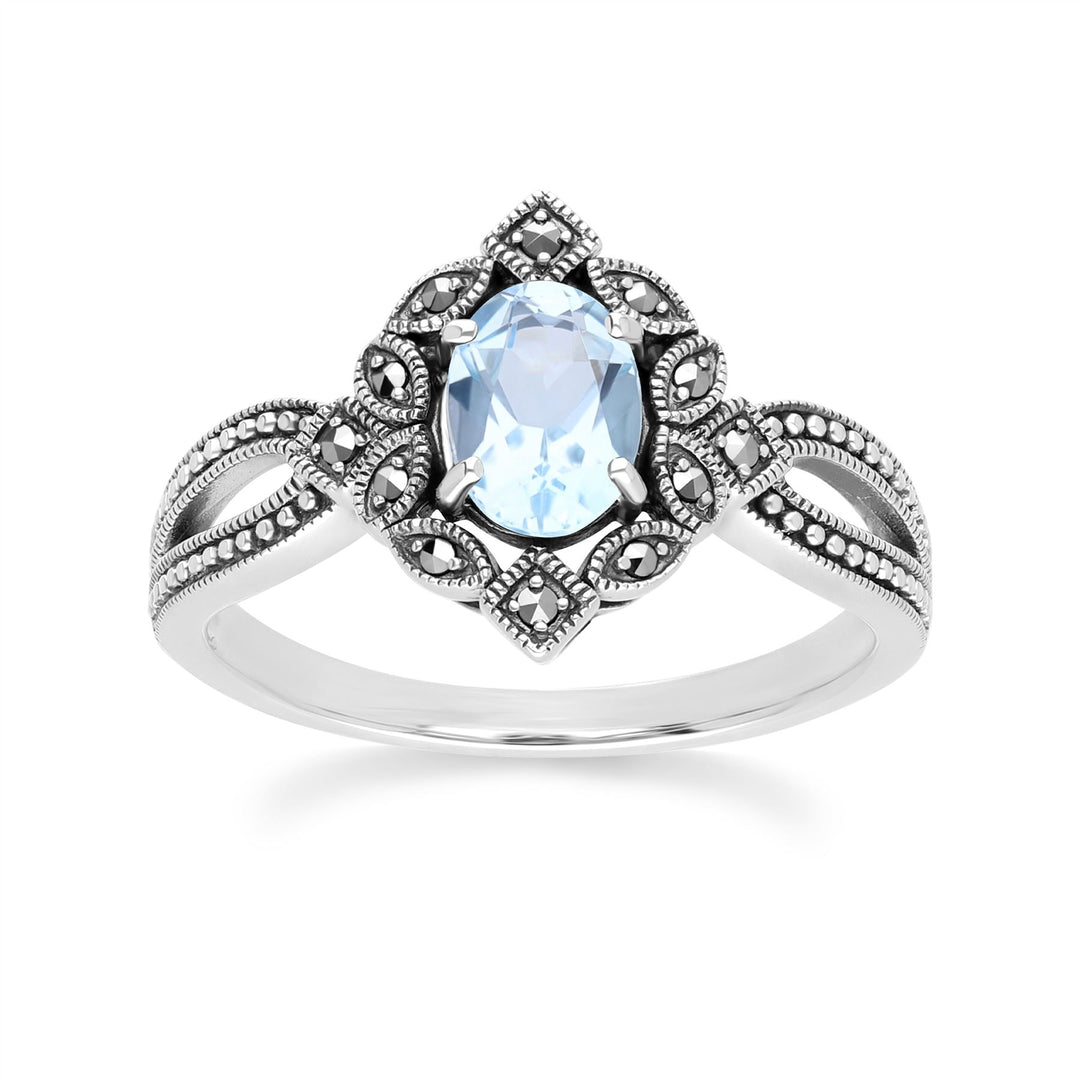 Art Deco Style Oval Blue Topaz & Marcasite Ring in Sterling Silver