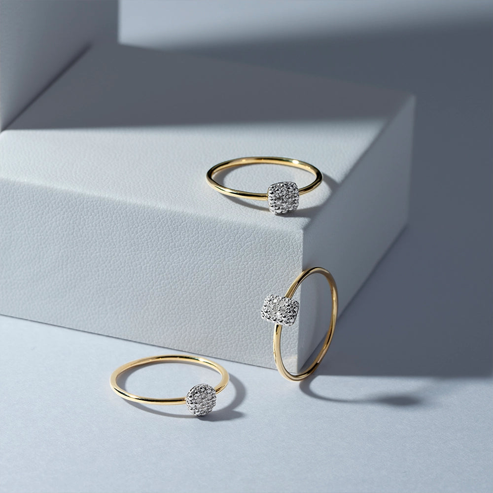 The Gemondo Diamond Pavé Collection encapsulates fluidity in warm golden designs encrusted with dainty diamonds. Decorate yourself generously with sparkling organic shapes dripping in modern sophistication.