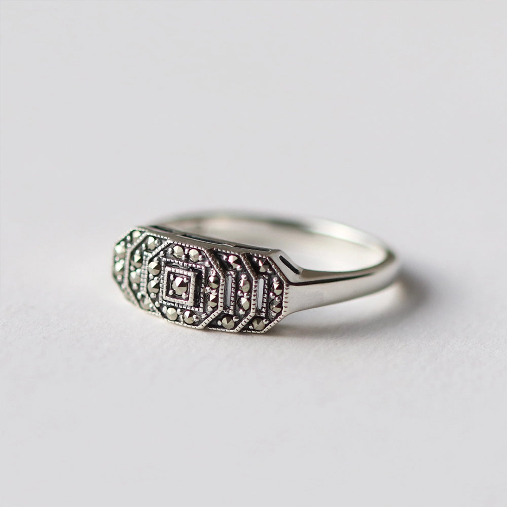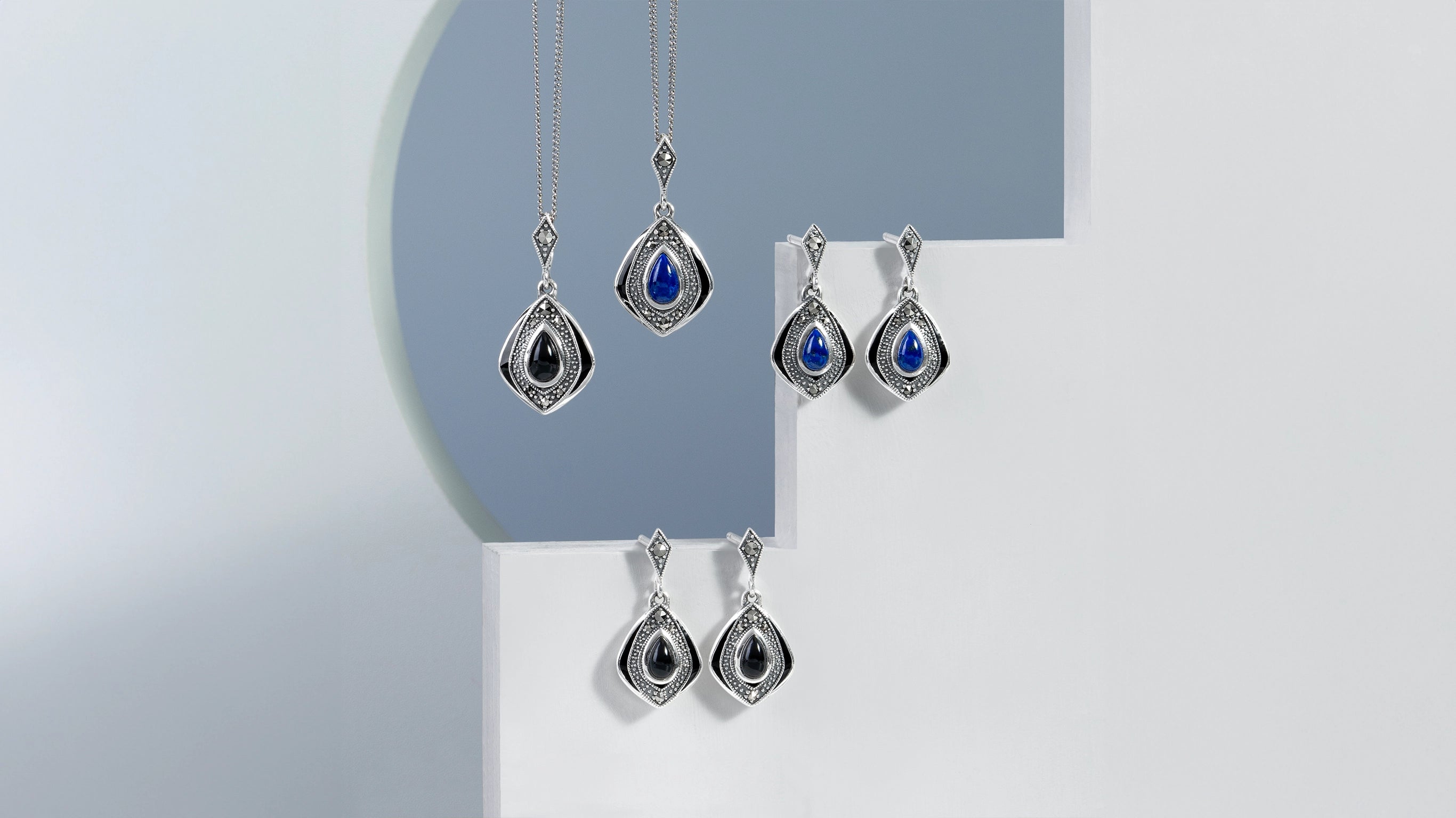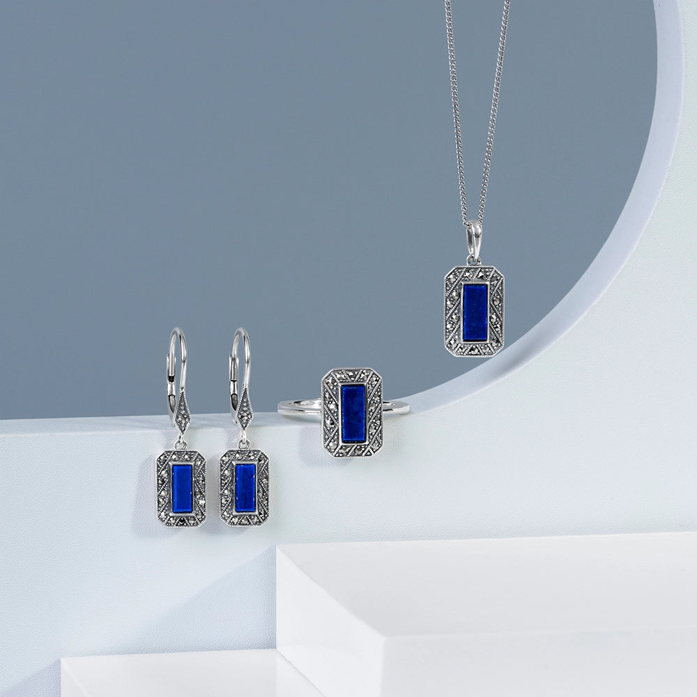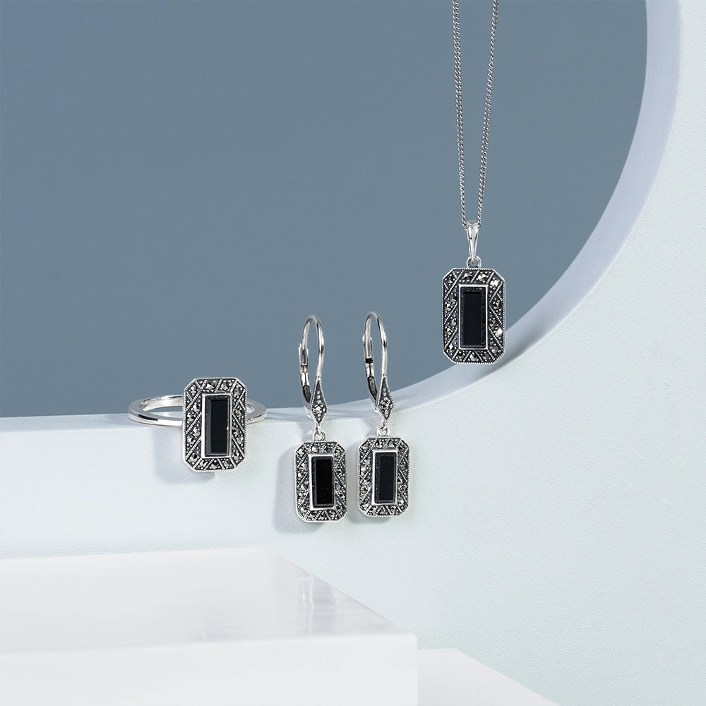 Inspired by the aesthetically beautiful and culturally significant, our Art Deco silver jewellery collection teams sterling silver with angular cut gemstones such as onyx, spinel, marcasite, mother of pearl and lapis lazuli. With bold geometric triangles, squares, circles and arcs, each design aims for a decadent kind of simplicity.